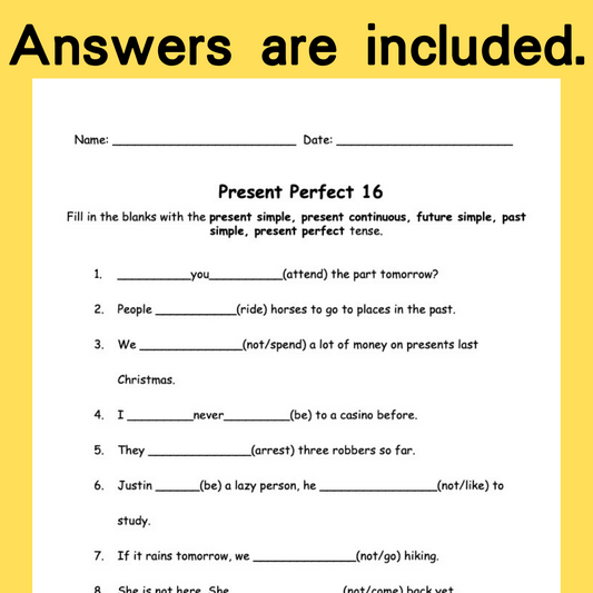 Present Perfect Tense Present Perfect Grammar Exercise (Electronic Version)